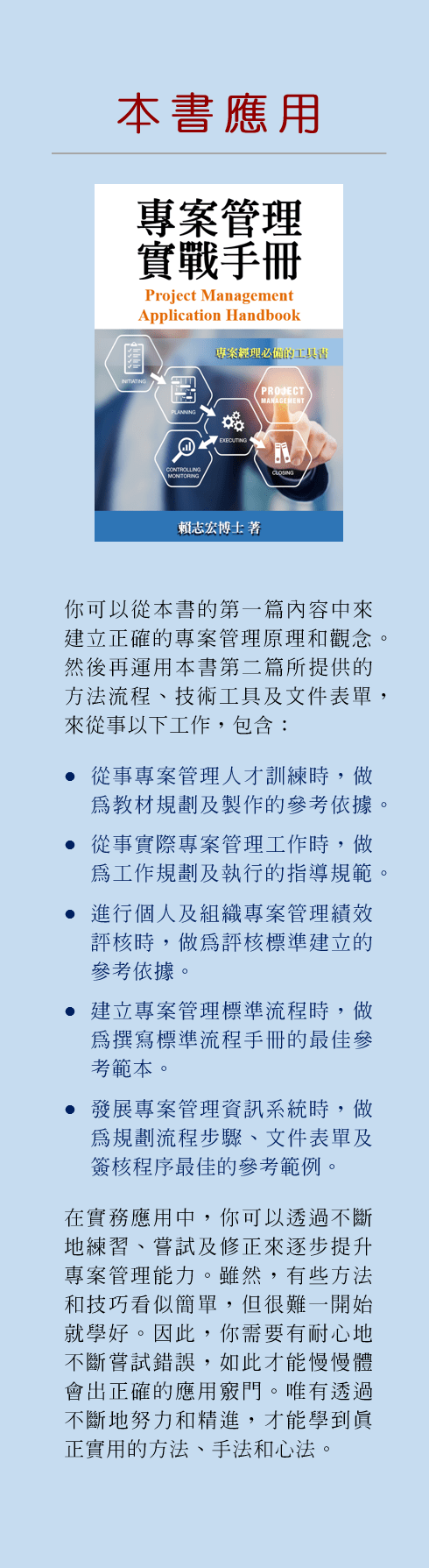 ¥»®Ñªº¬[ºc¤Î¤º®e´N¬O®Ú¾Ú¡§Â²³æ¡B¹ê¥Î©M¦³®Ä¡¨ªºì«h©Ò¼¶¼gªº¡A¨ä¥Dn¥Øªº¦bÅýŪªÌ¯à°÷¯u¥¿ªº¡§Â²³æ¤W¤â¡B¹ê°È¦n¥Î¡B²£¥Í®ÄªG¡¨¡C¦]¦¹¡A¥»®Ñ¤£¬O¾Ç®Õªº±Ð½Ò®Ñ¡A¤]¤£¬O»{ÃҦҸեΪº°Ñ¦Ò®Ñ¡A·íµM¤]¤£¬O¥uÁ¿ì²zÆ[©Àªº¤èªk½×¡A§ó¤£¬O³æ¯ÂªºÓ¤H¸gÅç¤À¨É¡C³o¬O¤@¥»¥i¥H¥Î¨Ó«ü¾ÉŪªÌ°µ¦n±M®×ºÞ²z¹ê°È¤u§@ªº°Ñ¦Ò¤â¥U¡A¥¦¥i¥H¾A¥Î©ó¦UºØ¦æ·~¡B¦UºØ±M·~»â°ì¤Î¦UºØ¸gÅçµ{«×ªº±M®×ºÞ²z¤Hû¡C
