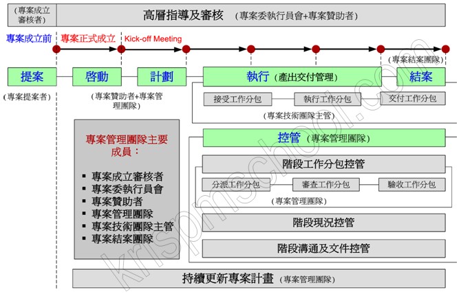 「專案管理的流程」是指:「在專案生命週期中,不同決策階層的專案管理團隊,根據個別的角色及職責,所有管理活動的程序或步驟」。這些專案管理活動包含三大類別,摘要如下: