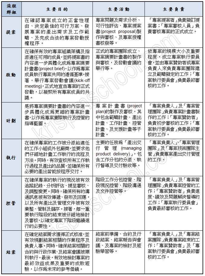 | 表1.1:專案管理六大流程的主要目的、活動與負責人員