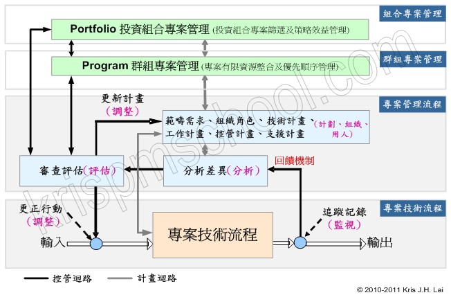 專案管理流程是整合企業專案管理的最佳流程及方法,用以協助專案在提案、起始、計劃、控管、執行及結案,各階段中的有效執行,包含所有專案管理流程架構、方法技術、作業規範、文件表單等。按照組織的管理階層分類,組織的專案管理流程包含投資組合管理流程(portfolio management processes)、群組專案管理流程(program management processes)、及專案管理流程(project management processes)等三種。 根據控制系統的原理來看,專案管理是一種反饋迴路(feedback loop)的機制。「迴路」是資訊循環的管道,用以傳送不同的訊息,以進行「目標設定、監視、分析、評估、及調整」的控制功能(見圖2.1)。在專案管理的控制系統中,具兩個最主要的迴路,亦即「計畫迴路」和「控管迴路」。所謂的「計畫迴路」就是:「專案的計劃是依據策略專案管理、群組專案管理及專案技術流程活動的需求及限制條件來擬定的。相對的,策略專案理與群組專案的計劃,也需要依據現有專案的執行現況及未來計畫來擬定。」這種傳遞相互作用及相互關聯訊息的回饋機制,正是迴路主要的功能。 |