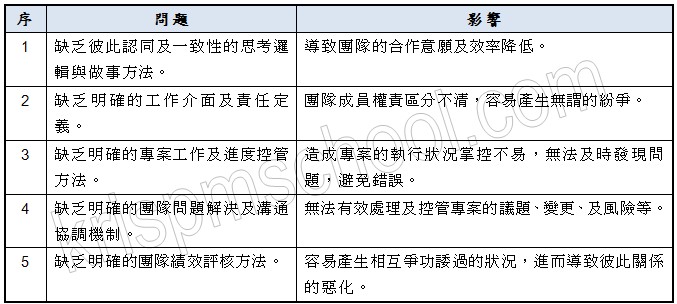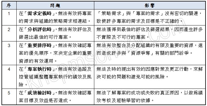 | 表3.1:缺乏專案管理標準流程對個別專案的管理所造成的問題