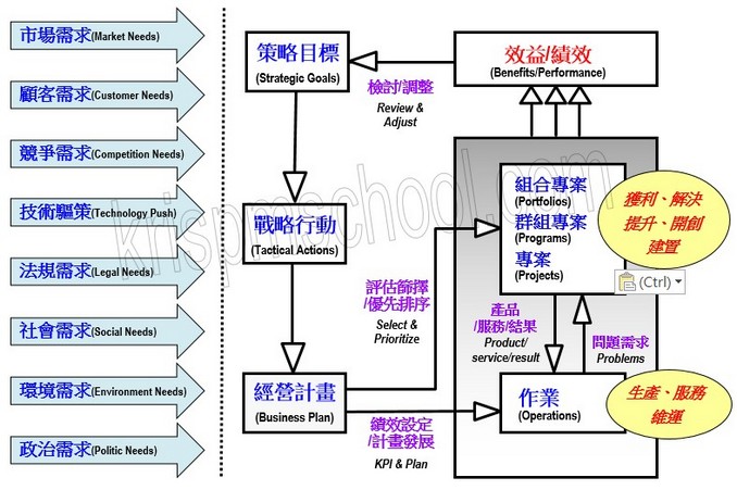 在外在環境不斷變化下,企業組織將面對各種挑戰和需求,包含:「市場需求」、「營運需求」、「顧客需求」、「技術趨策」、「法規需求」、及「社會需求」等。因此,為了確保其長久的生存及茁壯,必須不斷檢視策略的需求、方法及目標,然後,將這些策略需求轉化成具體的經營計劃。接著,仔細評估及篩選可行的專案計畫(包含投資組合、計畫、及專案等)及作業計畫來實現預期的效益。同時,在執行專案及作業的過程中,定期檢討實際的成果及效益,並作必要的策略調整,以適應外在環境新的變化(見圖2.1)。 |