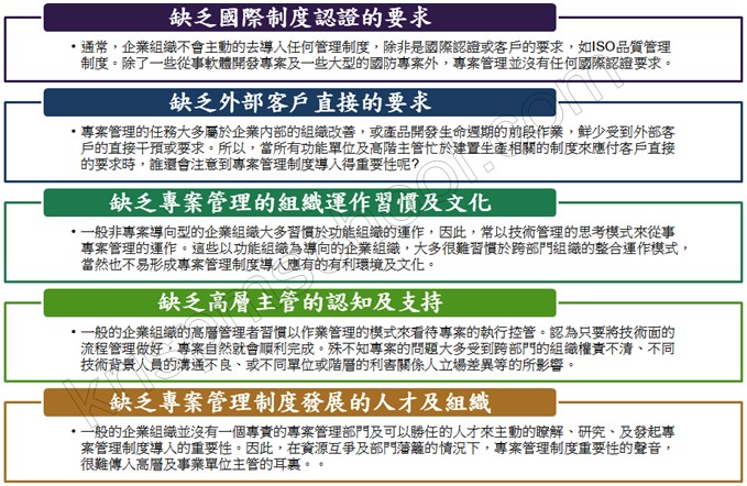 為甚麼專案管理制度導入普遍不受企業組織的重視呢?針對這個問題的原因,搜尋過去及現有可能的文獻報告,似乎沒有任何相關的資料可供參考及佐證,因此作者僅能根據觀察的事實來推論,或許結果並不是絕對的客觀,但對於初步瞭解上述問題的發生原因會有相當程度的幫忙,圖2.12列出並摘要說明幾個較重要的可能原因,當然,除了這五個主要的原因外,應該還有其它的可能因素。然而,不論甚麼原因,要強調的是:「就像ISO 9000國際品質管理系統或CMMI的導入一樣,任何企業組織的專案管理系統之規模大小、複雜程度、建置時程是可以依其獨特的需求來量身訂做的。」至於需不需要導入其實已不是問題。