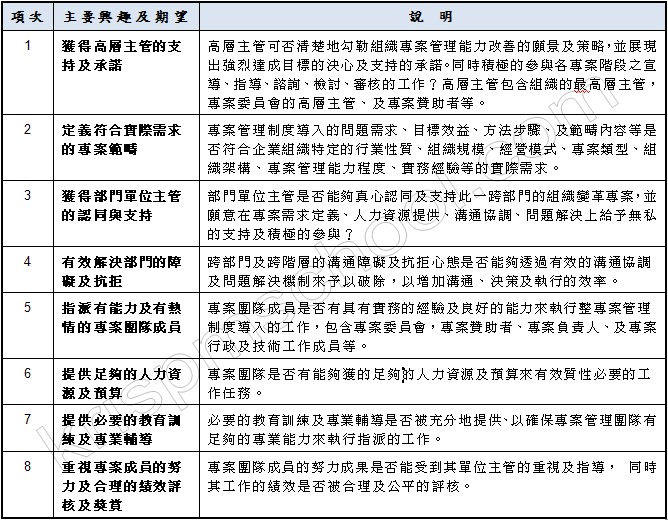 表3.2的8個共同的興趣及期望正是促成專案管理制度導入成功的主要關鍵因素,而這些因素則受到重要利害關係人間互動關係好壞的影響,由其在「政治面」、「組織面」及「人際面」等方面上的議題上,例如:在問題需求上的合理定義、在目標方法的正確判斷、在組織人事上的適當安排、在問題衝突上的有效解決、在團隊能力上的提升發展、在士氣激勵上的用心努力等方面。若缺乏重要利害關係人間良好的互動關係,將會嚴重影響他們之間再溝通協調及團體決策上的效率。