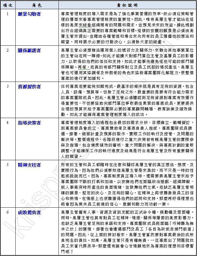 企業高層主管是公司專案管理制度需求及架構藍圖的提倡者,沒有他們的認知、承諾及支持,是不可能導入公司全面化的專案管理制度。這些高層主管包含CEO、策略辦公室或總管理處主管、及各事業處的最高主管,他們同時也是擔任專案擁有者、專案委員會及專案贊助者的主要成員。綜合本章各節所探討的重要觀念,下 表說明這些高層主管必須扮演的角色和擔負的責任: