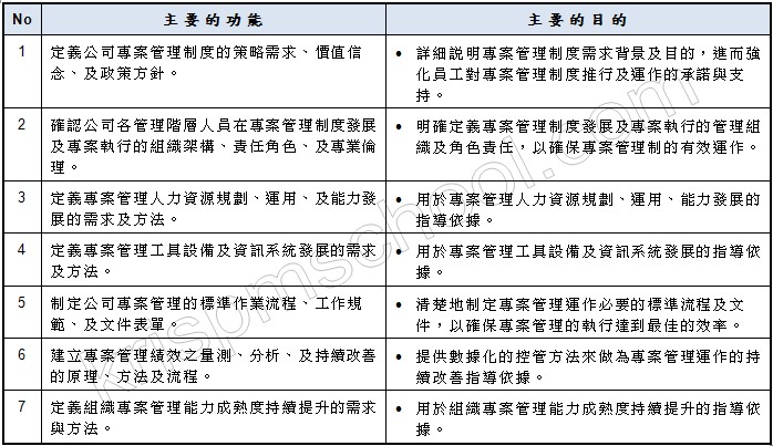 主要功能:分析組織現有的專案管理環境背景,包含過去的專案執行績效及可能問題,進而從策略管理的角度上來確認專案管理制度導入的主要原因和需求目的,並明確地擬定組織在專案管理系統發展的政策方針及目標,以做為制度導入及實施的最高指導依據。