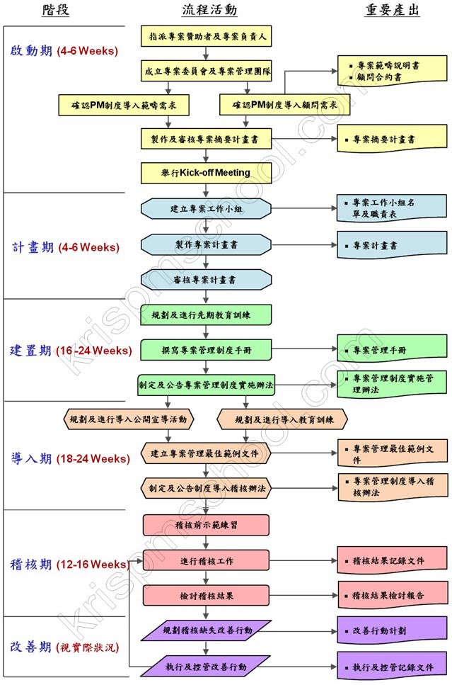按上述所列的重要工作項目,我們可進一步的將專案管理制度導入的工作區分為「起始期」、「計畫期」、「建置期」、「導入期」、「稽核期」、及「改善期」等六大階段。有關整個專案管理制度導入的流程架構及每個階段的重要活動和產出項目請見圖5.1。