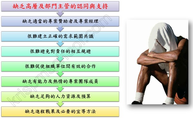 因此,唯有讓所有重要利害關係人都能認同他們各別的角色及責任,及瞭解他們各別的重要性及影響力,才能讓他們願意真心來參與及支持整個專案管理制度導入的行動。否則,就算大家表面上都好像支持,但行動上卻缺乏實際的作為。如此,就算專案管理制度的導入有再正當的需求及重要性,也只不過是個概念或理想。因為沒有人願意負責的專案,怎會有成功的可能呢?而這正是專案管理制度導入最常遭遇的問題。參考表3.2所列的重要利害關係人主要的興趣和期望,下圖列出專案管理制度導入的主要失敗因素。