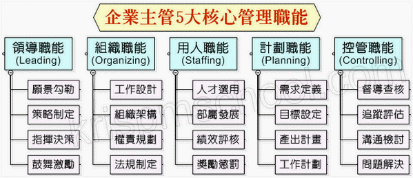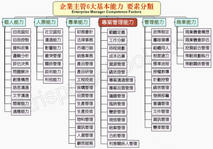 確認:企業主管必備的核心管理職能 許多專業的學術研究指出,現代的企業主管應具備六大群組能力 (見圖1.1)。而「專案管理能力」、「一般管理能力」、「商業能力」則與管理職能最有直接的關聯。然而,此三種能力群組中,有許多能力要素時類似的。因此,很難有系統辨認出那些才是必要的核心職能。然而,根據現代管理的定義,管理主要的工作可區分為:「領導」、「計劃」、「控管」、「用人」及「組織」。將其細分,可歸納出20個現代企業主管必備的核心管理職能要素 (見圖1.2)。 |