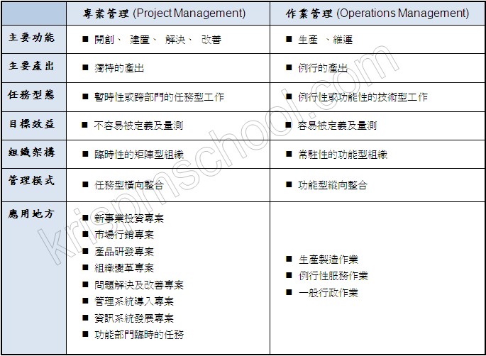 管理暫時性的專案工作和管理例行性的作業工作之最大不同在於:被管理團隊的特性和其工作方式的差異。基本上,同單位的人員具有較相同的專業背景,並經常在一起工作,因此較容易建立彼此的共識及合作默契,加上部門內通常具有標準作業流程來做為工作執行及控管的依據,因此,在溝通協調及監督控管上較容易。