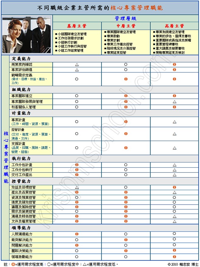 對基層主管而言,專案管理職能應偏重在技術工作的執行督導及產出品質查核的能力,因此較不需要很高深的計劃及控管技巧,同時也不需要太多的團隊建立及領導激勵的技巧。