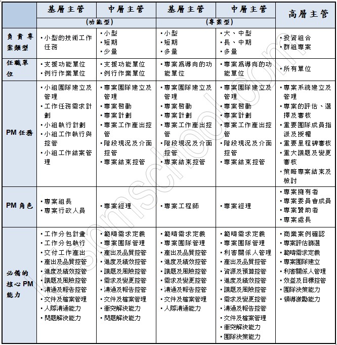「專案型」的基、中層主管:通常負責多量的各型專案,主要任職於以專案為導向的功能單位,例如:研發設計及軟體資訊等。