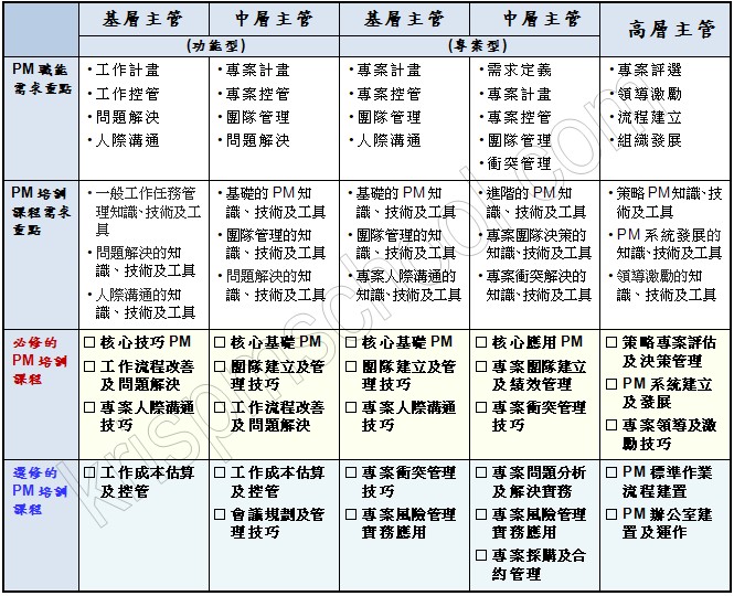 在表1中,所謂「 專案管理職能需求重點」主要是根據「必備的核心專案管理職能」所摘要的重點。而根據這些「 專案管理職能需求重點」,可進一步的歸納出「專案管理培訓課程需求重點」。接著,再根據筆者多年的培訓經驗,歸納出不同型主管「必修的專案管理培訓課程」及「選修的 專案管理培訓課程」。