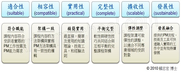 發展性 (sustainable):企業組織必需要有整體運作良好的專案管理環境及系統,才能讓主管們的專案管理能力有效的發揮。因此專案管理課程的內容架構除了要符合企業主管實際的工作性質外,還要能適應企業在 專案管理組織制度及系統持續發展的需求。本系列課程的所提供的方法架構及流程工具除了能符合企業主管實際的工作需求外,還能做為企業在持續發展其專案管理組織制度及系統的基礎架構依據。
