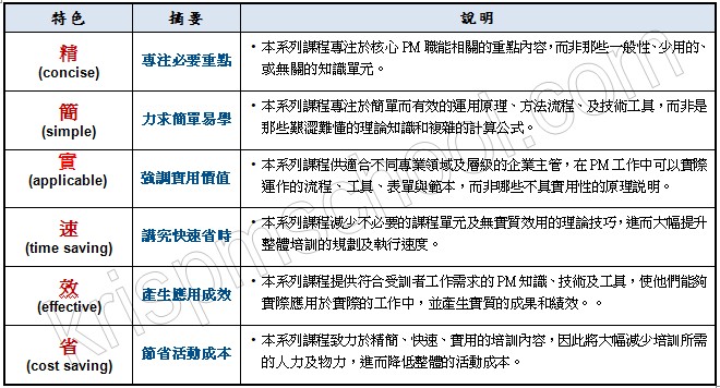 根據企業主管專案管理訓練課程規劃六個主要考量,我們可以進一步的歸納出此系列課程的六個主要特色,為了方便讀者的瞭解,我們以用「精(concise)、簡(simple)、實(applicable)、速(time saving)、效(effective)、省(cost saving)」等六個字來代表,其分別的定義為如下: