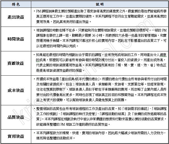 此六大特色其實是所有企業的主管培訓課程所期望達到的終極理想。因此,如果我們能以達到這六大特色為努力的目標,相信能夠讓企業的專案管理培訓課程產生許多實質的效益,而這些效益可從「產出、時間、資源、成本、品質、實用」等六大構面來探討(見表2),此六個構面的定義如下: