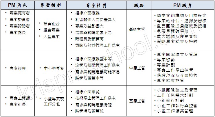 綜合上面的說明,下表把專案經理的角色用三個不同的階層來區分,同時列出其可能參與的專案類型、專案性質及相對所需擔負的責任。